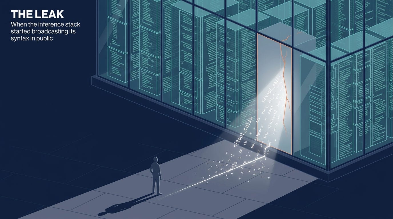 A content-delta leak is when that structure breaks down. The model emits the tool-call syntax as delta.content with finish_reason: stop. The parser gets plain text instead of a structured payload. Nothing executes. The literal token string — <|tool_call>call:exec{command:…}<tool_call|> — goes wherever content goes. In this case: Slack.
